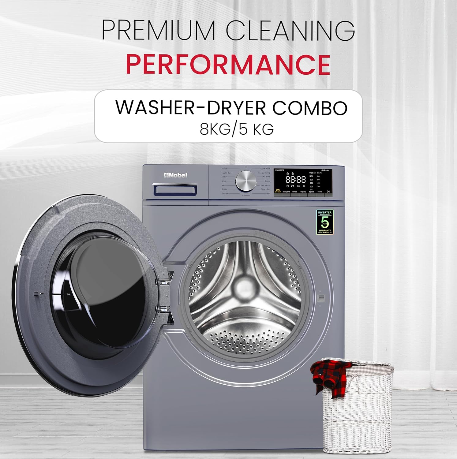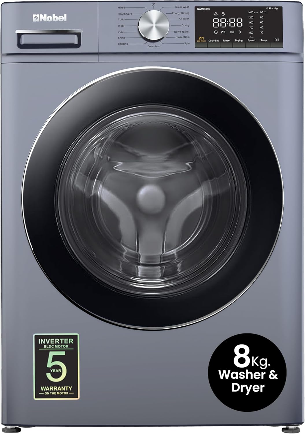 Nobel Front Loading Washer Cum Dryer Dark Silver 8 Kg/ 5 Kg 1400Rpm Stainless Steel Drum Inverter Bldc Motor Nwm860Fs"Min 1 year manufacturer warranty"