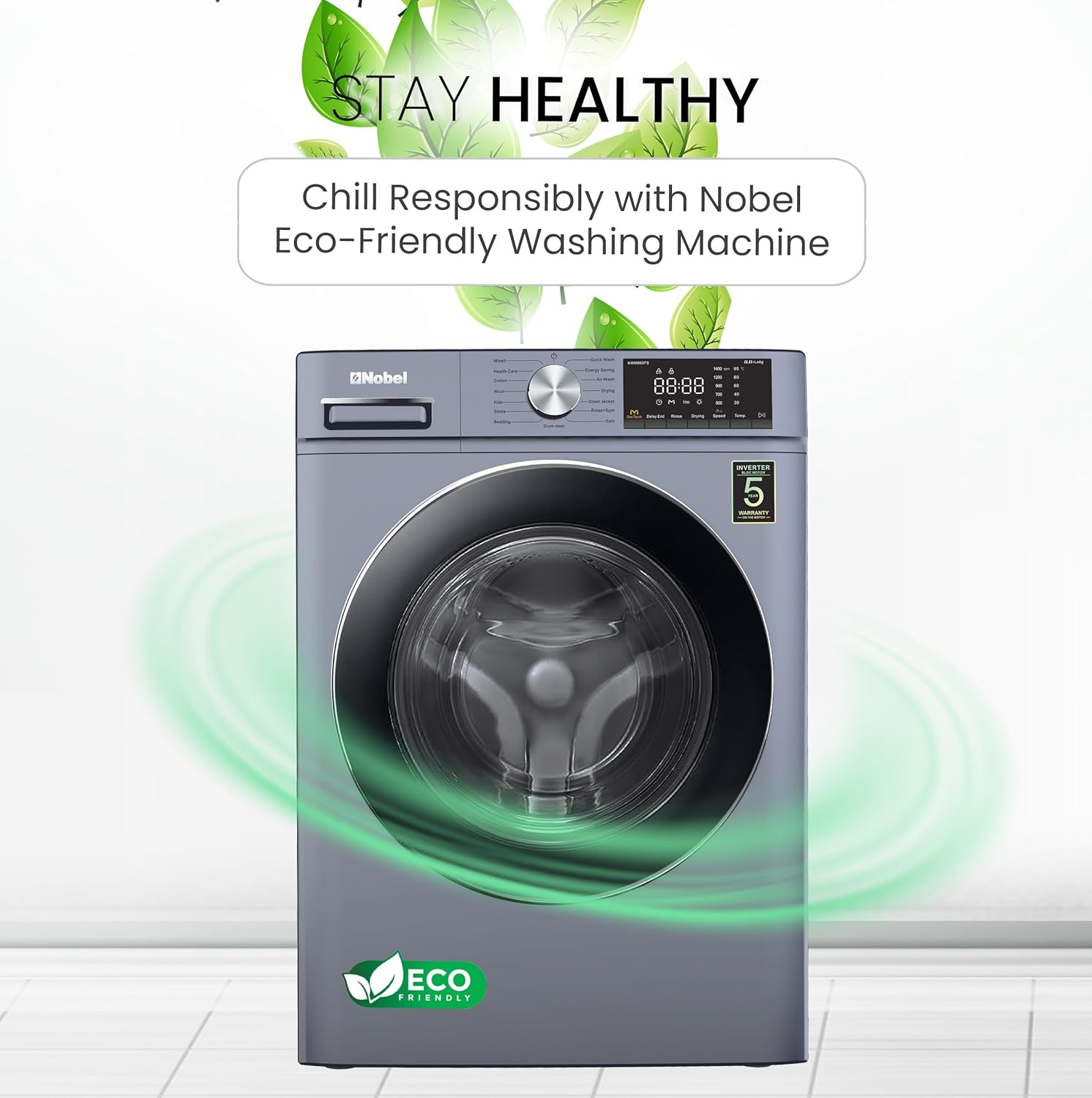 NOBEL FRONT LOAD WASHERS SILVER 10 KGS 1200RPM STAINLESS STEEL DRUM INVERTER BLDC MOTOR NOBEL-NWM1000FSI