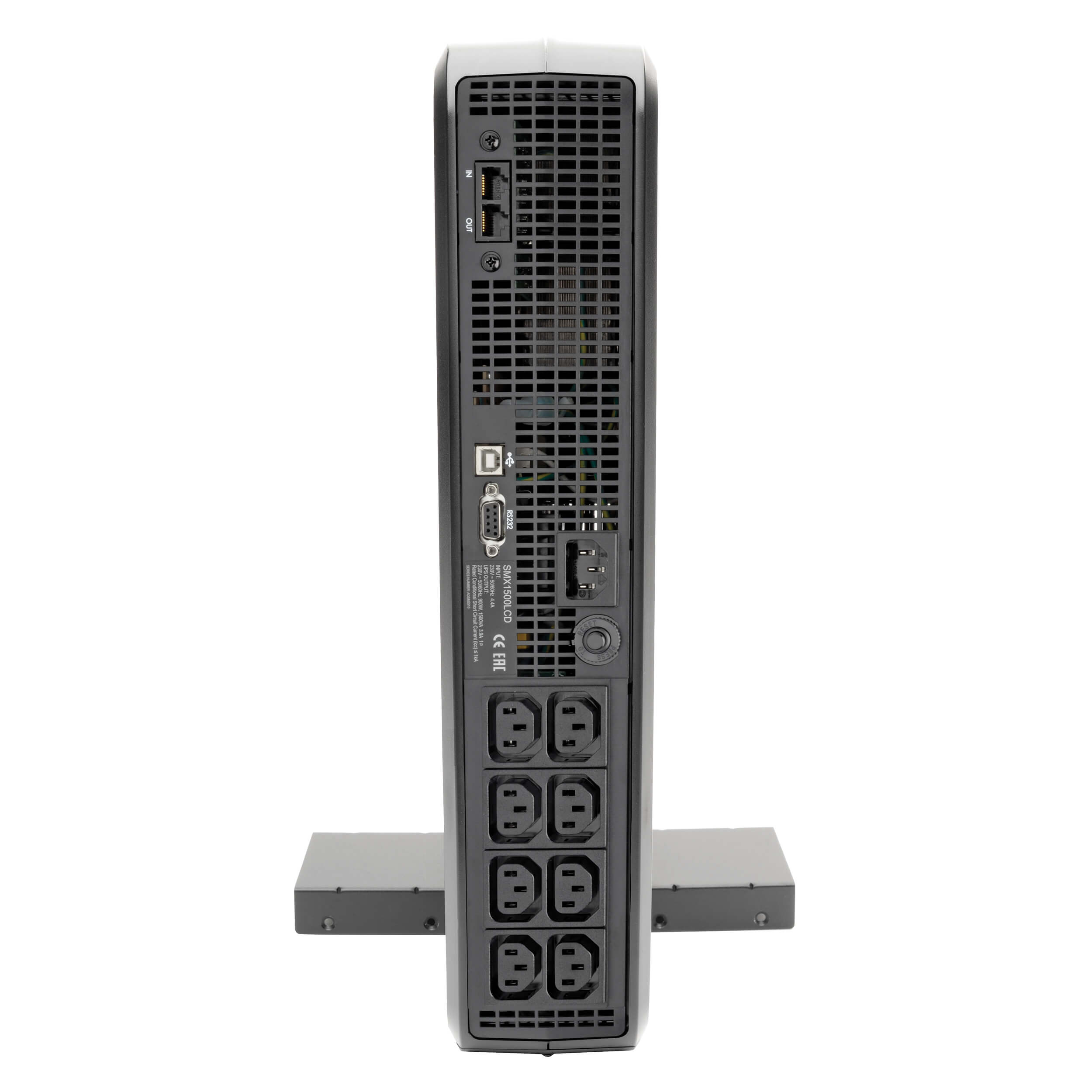 Hardware is included for mounting the SmartPro UPS system in 2U of space in an EIA-standard 19-inch 4-post or 2-post rack. It will also stand in a tower position using the included hardware for extra stability. You can rotate the LCD screen to match the UPS’ orientation. The unit has a C14 power input that connects to an AC power source with an appropriate cord.