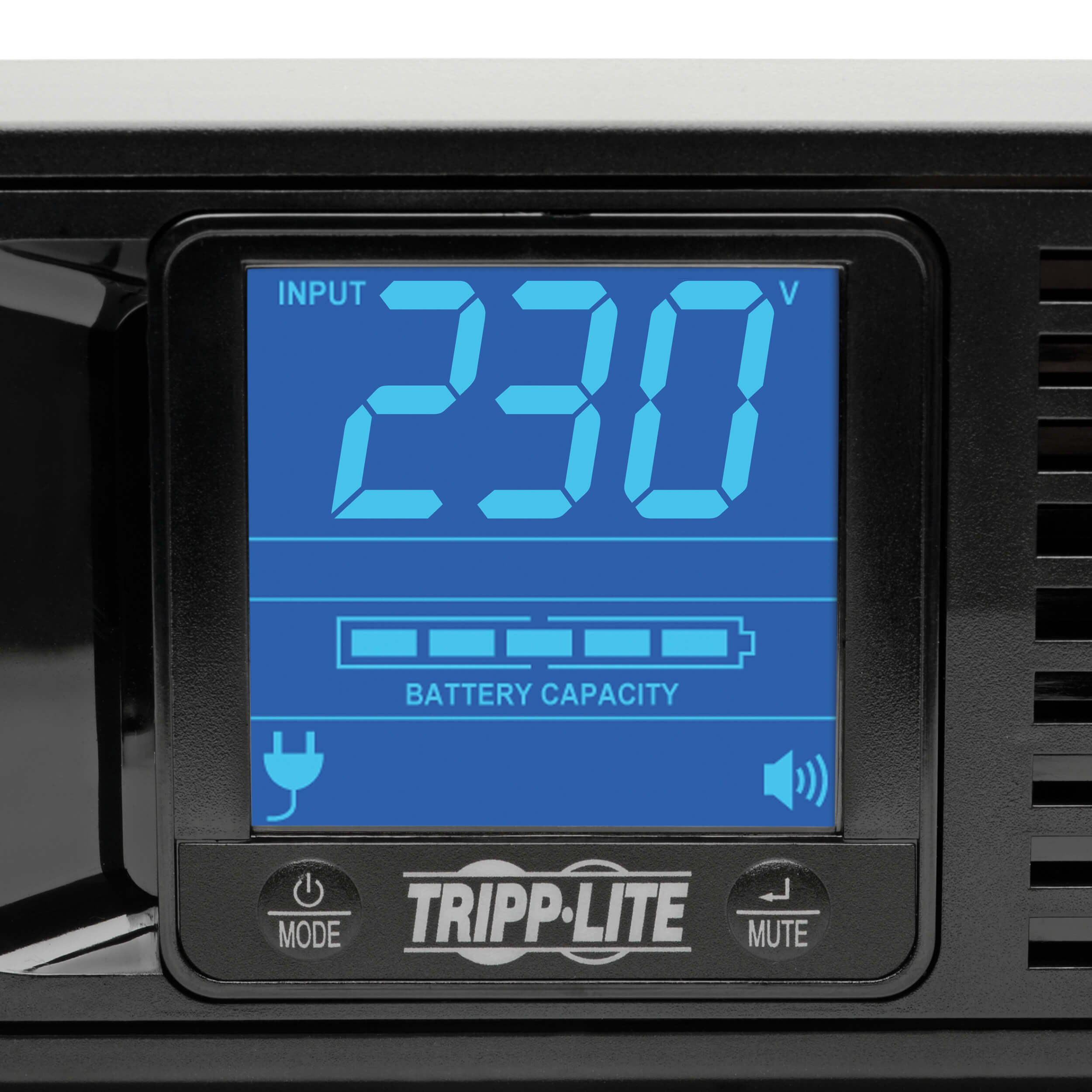 The LCD screen indicates input voltage, battery charge level, overload, AVR, on-battery and replace battery status. It rotates for easy viewing in either rack or tower configuration. The audible alarm sounds for power failure, low battery and overloads. You may silence it using the built-in switch or disable it remotely through your PC.